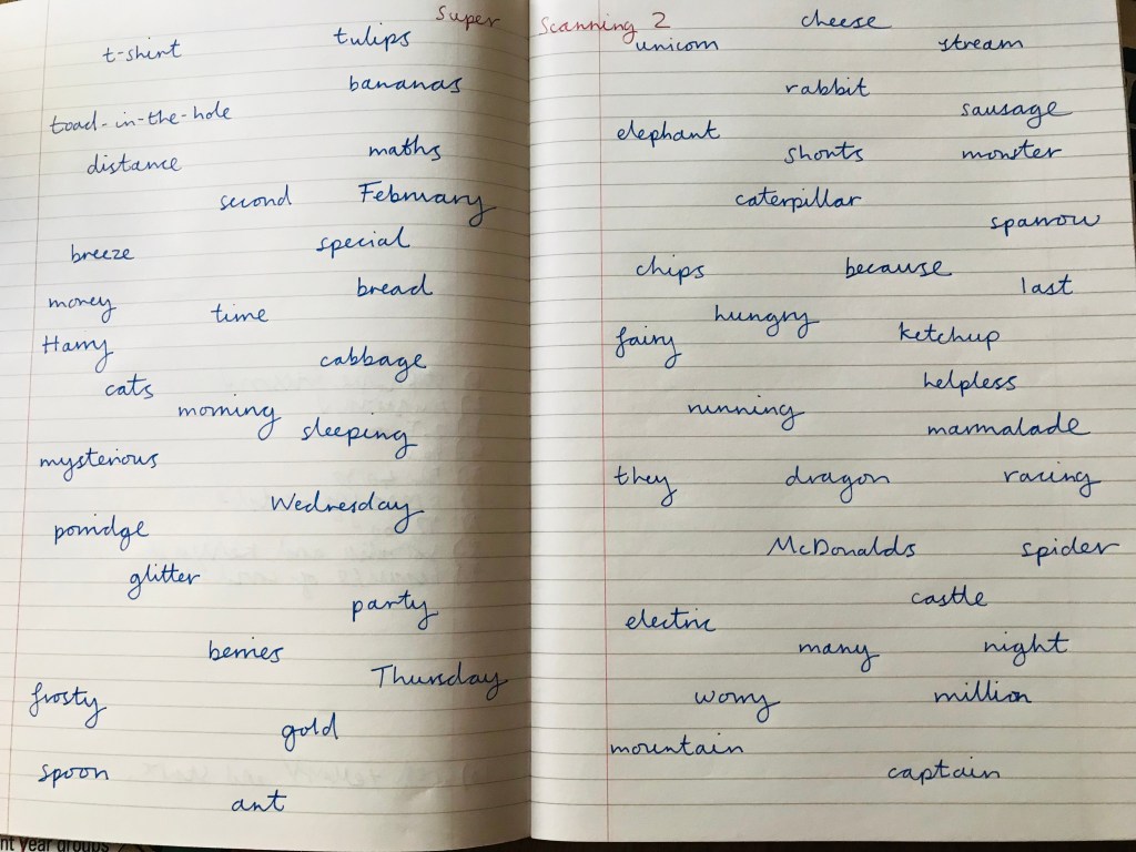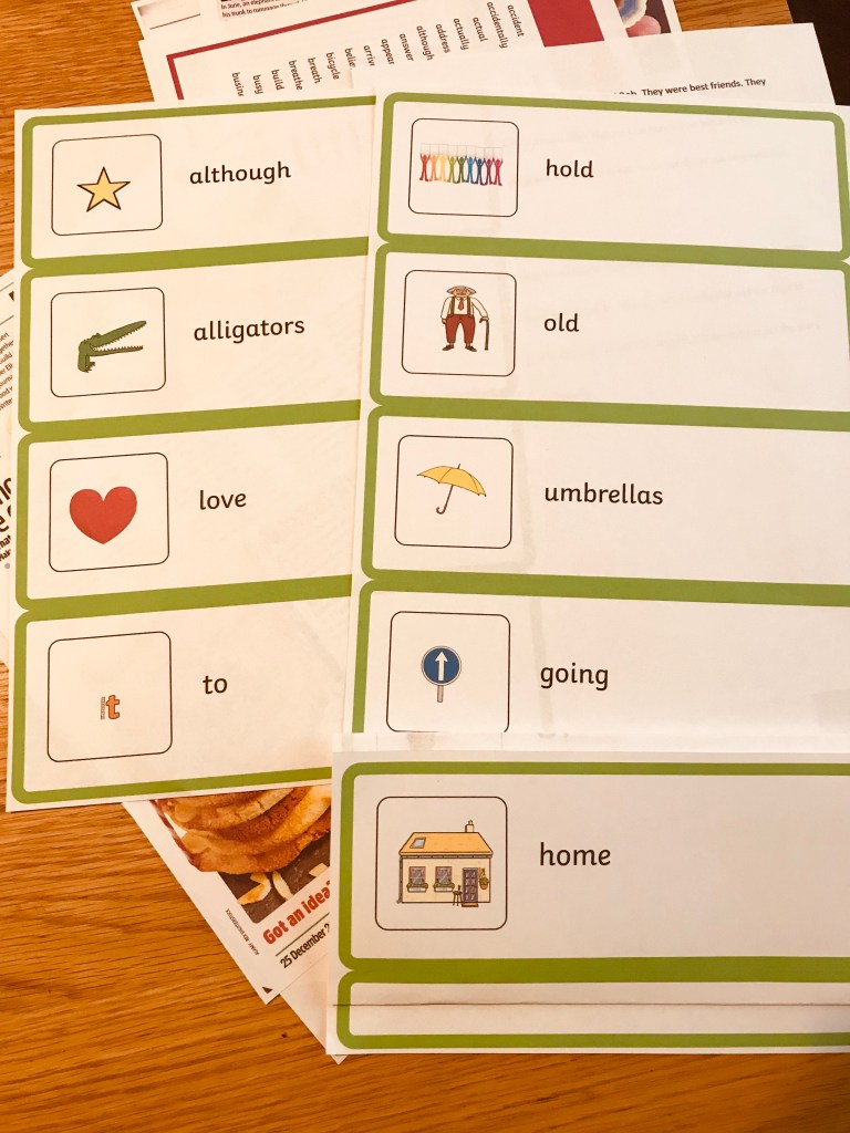 As promised, a literacy-themed ‘working wall’ – word hunt challenge. We are still going – 18 words so far. ‘Mum’ is a bit of a cheat, but I had to let it pass…! How many can you and yours find? What is the longest word you can find?
